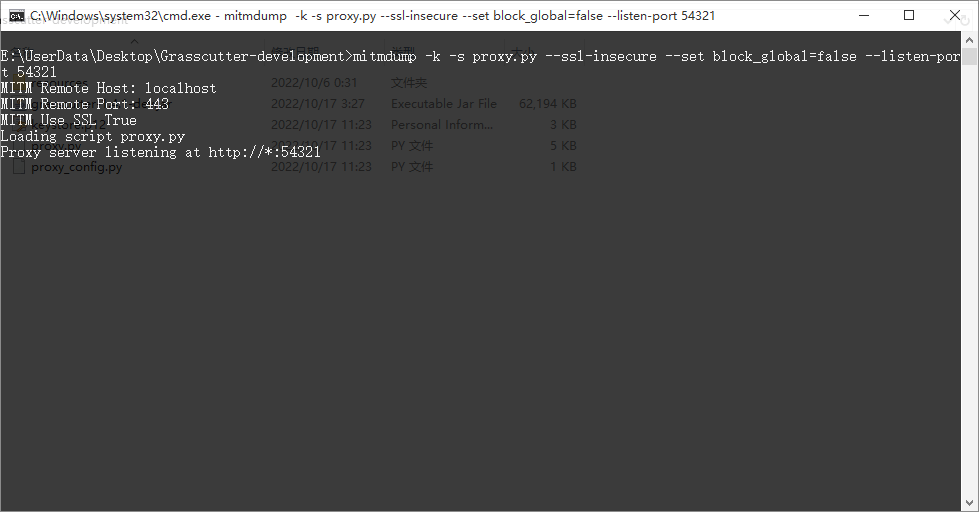 mitmdump -k -s proxy.py --ssl-insecure --set block_global=false --listen-port 54321若没有公网连接需求,删除