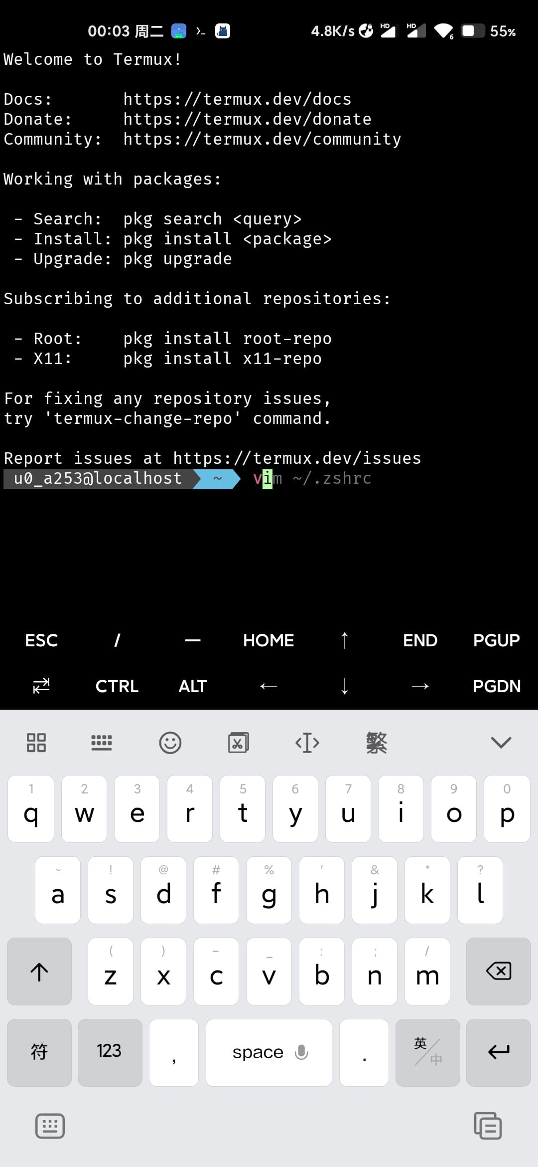 # 加入之后如下,点击 ESC 输入 :wq 保存重启 Termux 即可生效