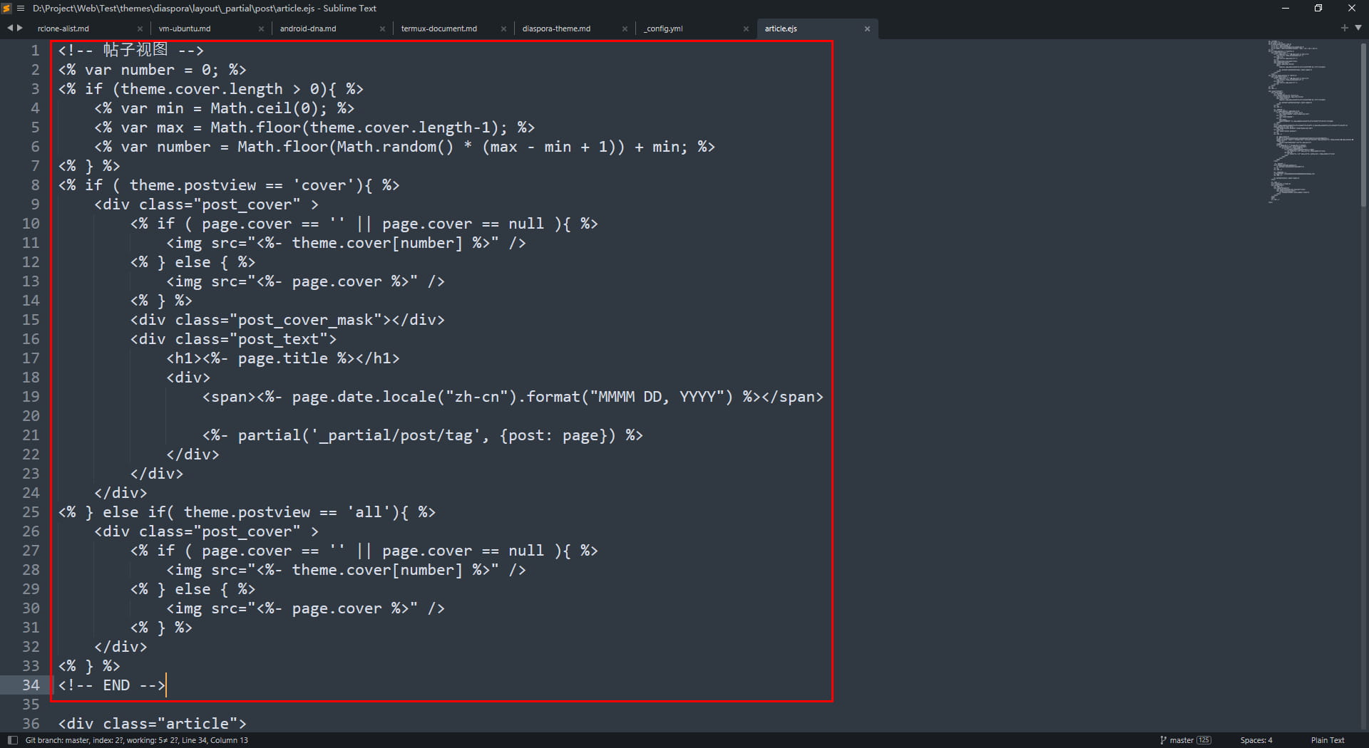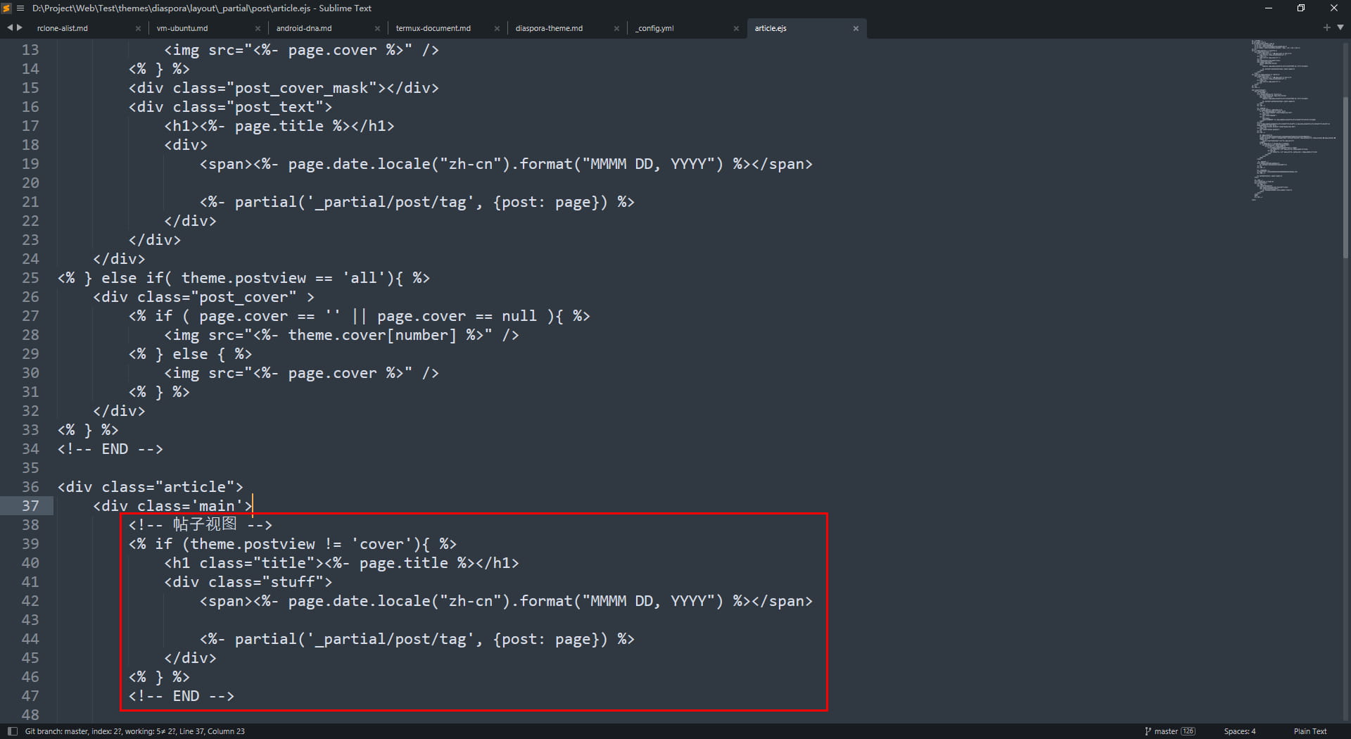 }Themeroot/layout/_partial/post/article.ejs,把图上的代码,修改成下列代码1